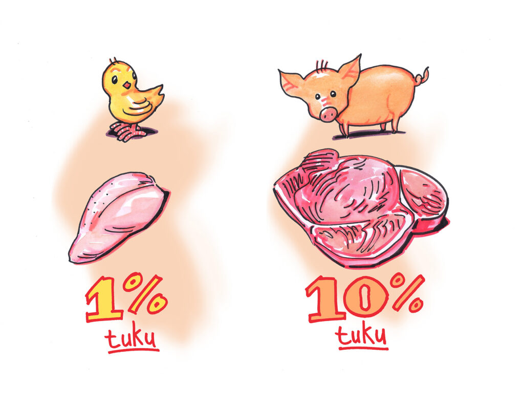 - kuřecí stehno s kůží/bez kůže: 14 g/7 g tuku na 100 g.